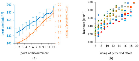 Inter-individual means and standard deviations for heart rate and the ratings of perceived effort (a). Individual data are shown in (b).