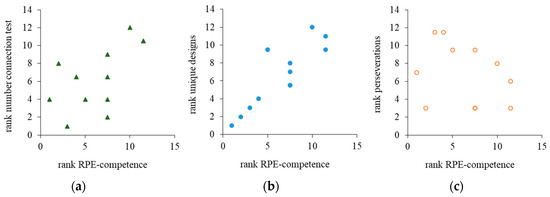 Rank correlations between rating of perceived effort (RPE) competence, performance time in the Number Connection Test (a), unique designs (b) and perseveration errors (c) in the Five-Point Test.