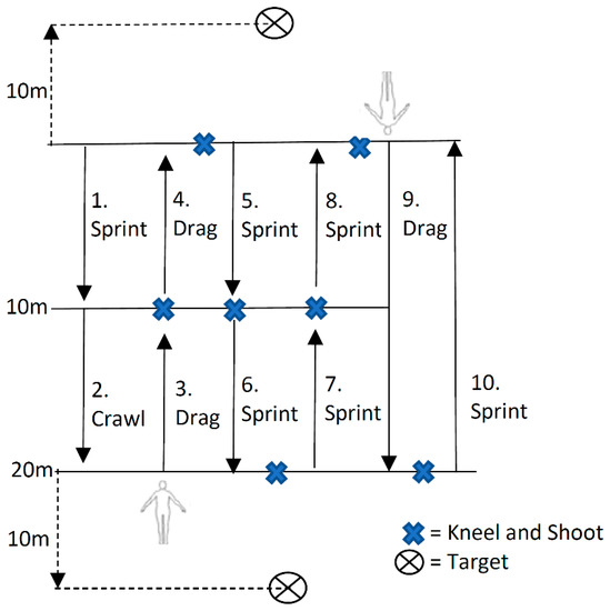 Correct set up of the assessment required six marker cones, a 70 kg mannequin dummy with a 10 kg plate carrier vest secured over the mannequin upper body, handheld stopwatch and recording equipment. Candidates started at base line, facing towards a series of parallel lines identified with marking cones placed at distances of 10 m and 20 m (Figure 1). Once on the base line, candidates were asked to stand with one foot on or behind the starting line with their muzzle raised and aimed at a target in front of them (up to 30 m away). On command, candidates were required to complete a series of timed sequential actions as follows: (1) sprint to the first opposing 10m parallel line; (2) upon arriving at the 10 m mark, candidates were to quickly drop into a prone position and crawl to the next opposing 20 m line; (3) on reaching the 20 m mark opposite the starting line, candidates were required to sling their primary weapon, and raise the upper body of an 80 kg dummy off the ground and quickly drag the dummy backwards until the 10 m line was reached; (4) on reaching the 10 m line, the dummy was to be lowered to the ground, candidates dropped to a kneeling unsupported position, raised the muzzle of their primary weapon and took aim at a target with accuracy confirmed by the assessor when the laser sighting system aligned and was held momentarily on the target (termed sight picture); (5) on achieving a sight picture, the candidate again slung their weapon and picked up the dummy and dragged it a further 10 m backwards, where, on arrival of the starting line, the dummy was lowered and a kneeling firing position was taken; (6) once achieving a sight picture on the target, the candidate stood up and sprinted to the 10 m mark where the same kneeling unsupported firing position was adopted and a sight picture taken; (7) this action was repeated to the 20 m line and was followed by a 180 degree turn (keeping lowered body posture) leading into the same kneeling firing position; (8) on achieving a sight picture on a second target (behind the starting line), the candidate stood up and sprinted back to the 10 m marker and, again, adopted the firing position and sight picture; (9) this was repeated once more, where, on reaching the starting line, the candidate slung their weapon, picked up and dragged the dummy as quickly as possible for the full length of the course (20 m) before again adopting the kneeling firing position (facing towards the starting line); (10) on achieving the sight picture, the candidate stood and sprinted as quickly as possible to the start line to finish the assessment.