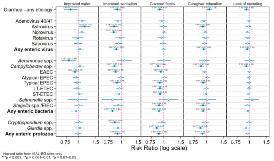 Colston JM, Faruque ASG, Hossain MJ, Saha D, Kanungo S, Mandomando I, Nisar MI, Zaidi AKM, Omore R, Breiman RF, et al. Associations between Household-Level Exposures and All-Cause Diarrhea and Pathogen-Specific Enteric Infections in Children Enrolled in Five Sentinel Surveillance Studies. International Journal of Environmental Research and Public Health. 2020; 17(21):8078. https://doi.org/10.3390/ijerph17218078