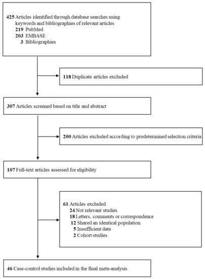 Figure 1 shows a flow diagram for the selection process of relevant studies. We identified a total of 425 articles from three core databases with 219 articles from PubMed, 203 articles from EMBASE, and 3 articles from hand-search. After excluding 118 duplicate articles and 200 articles that did not satisfy the pre-determined selection criteria by reviewing those titles and abstracts, the full texts of the remaining 107 articles were assessed for the final selection. After reviewing the full texts, 61 articles were excluded for the following reasons: not relevant studies (n = 24), letters, comments, or correspondence (n = 18), shared an identical population (n = 12), insufficient data (n = 5), and cohort studies (n = 2). The remaining 46 case-control studies (13–58) were included in the final analysis.