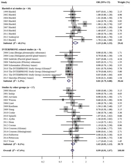 In the subgroup meta-analysis by research group, cellular phone use was associated with marginally increased tumor risk in the Hardell studies (OR, 1.15 (95% CI, 1.00 to 1.33; n = 10; I2 = 40.1%), whereas it was associated with decreased tumor risk in the INTERPHONE studies (OR, 0.81; 95% CI, 0.75 to 0.88; n = 9; I2 = 1.3%). In the studies conducted by other groups, there was no statistically significant association between the cellular phone use and tumor risk (OR, 1.02; 95% CI, 0.92 to 1.13; n = 17; I2 = 8.1%).