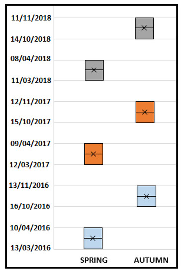 The two weeks belonging to the control period and the exposure period identified by daylight saving time (DST) during each year analyzed (2016–2018) are reported (grey is related with 2016, orange with 2017 and light blue with 2018).