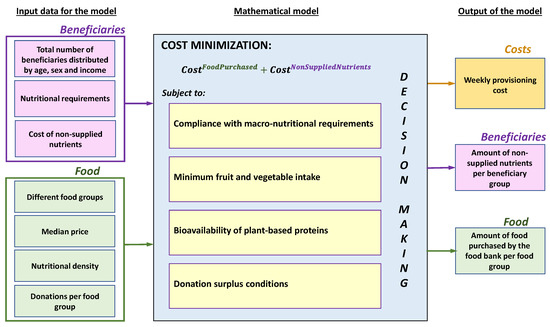 More specifically, the model minimizes the sum of the costs of purchasing food and non-supplied nutrients. The purchases cover the nutritional requirements of different population groups (configured by sex, age and income range) and are complemented by the resources obtained by the food bank as donations. The main constraints allow one to satisfy the minimum nutritional requirements, provide variety in the diet, and comply with the biological mechanisms of nutrient absorption, among others.