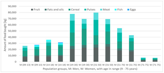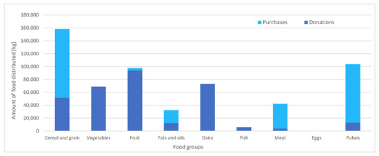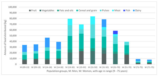 It can be verified that the aggregate of purchases and donations (Figure 3) responds consistently, since the proportionality between the quantity of food distributed and the number of beneficiaries per population group in Table 5 holds. Regarding the distribution of the food among the beneficiaries, there is a strong presence of the nutritional groups of cereals and pulses throughout all population groups as well as a predominance of meat over fish as a source of animal protein. Figure 2 highlights the role played by dairy and vegetables: the distribution of these food groups occurs only due to donations, and not because of purchases. These donations displace meat and fruit consumption, respectively, which allows for the satisfaction of the minimum consumption of fruits and vegetables and bioavailability condition of plant-based proteins. Another interesting observation is the fact that dairy products are mainly distributed among the minor and the elderly groups and that vegetables are distributed among adults (between 31 and 70 years old), which seems to imply that the nutritional contributions of these foods adjust particularly well to these population groups. Finally, some attention should be drawn to the differences in donations of short-term perishables (fish and meats) vs. non-perishables (such as pulses, or grain). These differences might reflect donators’ perception of a lack of storage capability of the food bank for animal-protein-based food groups, for example, due to an insufficient capacity of preservation technologies, or due to a scarcity of food management professionals. In the case of a strong misalignment between donator perception and the reality of the food bank, it could be beneficial for the latter to devote additional efforts in informing donators of their actual storage capabilities.