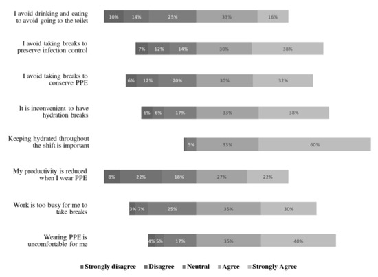 - “I avoid breaks to conserve PPE” (W = 4114.5, p < 0.01);