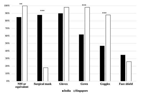 - N95 masks: Singapore (n = 55, 100%) vs. India (n = 93, 85%) (χ2(1) = 7.878, p < 0.01);