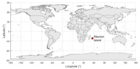 Reunion Island (Figure 1) is a tropical island in the southwest of the Indian Ocean, and is well known as a touristic destination due to its varied attractions such as subtropical rainforests, an active volcano, and lagoons. Listed as a world UNESCO heritage site since 2010, the wide biodiversity of endemic plants and animals generates a great interest for the destination [21]. In this context, more than 500,000 tourists (2018 data [22]) visit Reunion Island every year. Several outdoor activities are possible all year round due to the tropical climate. Tourists as well as the local population (+800,000) may experience intensive UVR exposure.