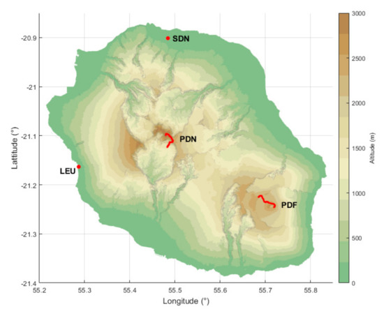 Measurement campaign locations at Reunion Island. The red dots show St-Leu Beach (LEU) and OPAR UV station at Saint-Denis (SDN). The red lines show the hike paths during the Piton de la Fournaise (PDF) and Piton des Neiges (PDN) hikes. The color bar on the right side displays the altitude in meters.