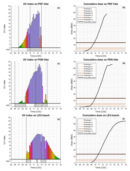 (a,c,e) show UVI recorded at PDF, PDN, and LEU, respectively. The colors of the histograms are similar to those used by the WHO, but with some variations within each color band to show more details. Vertical dotted lines show the beginning and the end of the activities. For PDF and PDN, a third vertical dotted line shows the U-turn point, between the ascending and descending part of the hikes. The grey surfaces, ENV., at the bottom of the figures show environmental effects affecting UVR, mainly cloud cover and shade. Cumulative UV doses at PDF, PDN, and LEU are shown in (b,d,f), respectively. The black curves on the right plots represent the cumulative exposure doses, while the superimposed horizontal lines show the threshold for one exposure dose to sunburn as a function of skin phototype (Table 1).