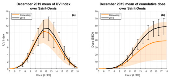 (a) represents a comparison of UVI between the December 2019 mean (black) and the December climatological mean (orange) at Saint-Denis; (b) represents a comparison of the cumulative exposure dose (SED) between the December 2019 mean (black) and the December climatological mean (orange) over Saint-Denis derived from UVI data (a). The orange lines represent the December climatological mean and the shaded areas one standard deviation as derived from 2009–2019 observations. The black lines represent the December 2019 mean and the vertical black bars one standard deviation.