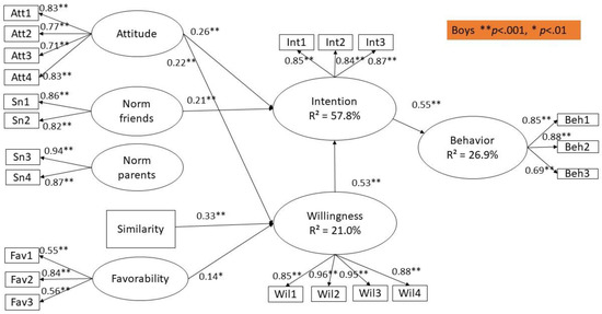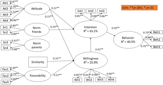The age of the respondents was only significantly associated with adolescent’s posting of sexy pictures on Instagram (β = 0.09, p < 0.001) and prototype similarity (β = 0.07, p = 0.003). The gender of the adolescents was significantly related to behavior (β = −0.08, p = 0.002), attitudes (β = −0.22, p < 0.001), subjective norm of the friends (β = −0.15, p < 0.001), subjective norm of the parents (β = −0.27, p < 0.001), prototype favorability (β = −0.30, p < 0.001) and prototype similarity (β = −0.11, p < 0.001). Given the significant association between gender and all constructs, we decided to conduct a multi-group structural model with gender as the grouping variable (see Figure 2 and Figure 3). For the purpose of clarity, we have presented the results in separate figures. Between the groups and for each path, one-by-one comparisons of the constrained model to the unconstrained model were made to test whether the strength of the pathways differs among boys and girls. Chi-square difference tests revealed no significant differences between both groups.
