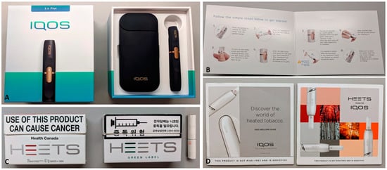 IQOS products and marketing materials used in the study. (A) IQOS 2.4 device (same as the one available in the US at time of publication): charger (left) and holder (right) in the box; (B) IQOS Quick Start Guide, (C) Tobacco sticks (HEETS; Left: Canada, “Red”; Right: Korea, “Green Label”, warning label reads “danger of addiction” and “e-cigarettes cause nicotine addiction” and lists a Quitline number); (D) other marketing materials (Left: IQOS device brochure; Right: HEETS brochure). The device brochure includes claims of “cutting edge technology”, “a better choice”, “heat not burn”, and “no smoke” (e.g., “no smoke: IQOS leaves no smoke smell on you and around you”). The HEETS brochure describes five different blends (e.g., “Elm” and “Birch”) using metrics on “aroma”, “body”, and “taste” and promotes “finding your perfect flavor”. Menthol HEETS were acquired in Korea; all other products were acquired in Vancouver, BC, Canada.