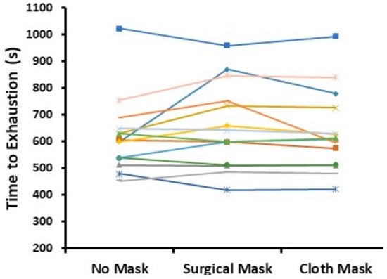 Time to exhaustion during the exercise test was not different for face mask compared to no face mask conditions (622 ± 141, 657 ± 158, and 637 ± 153 s for no mask, surgical mask, and cloth mask conditions, respectively; Figure 1; p = 0.20; power = 33%). Further, there were no differences between sexes and no condition × sex interaction.