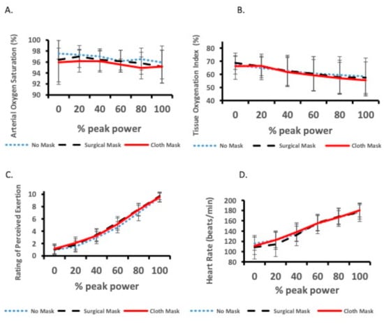 The progressive exercise test was performed on a Monark Ergomedic 828E cycling ergometer (Vansboro, Sweden). The cycling protocol initially involved resting for 5 min and then performing a 5-min warm-up at a self-selected resistance, which was recorded and used on subsequent visits (face masks were worn during rest and warm-up if the participant was doing one of the face mask conditions). The starting power output on the ergometer ranged from 35 to 100 W depending on the fitness level and was increased 35 W every 2 min until volitional fatigue, with participants cycling at 70–75 revolutions per minute []. Starting load (power output) for each participant was recorded and replicated on subsequent conditions. Heart rate (Polar Electro, New Hyde Park, NY, USA), arterial blood oxygen saturation monitored with a pulse oximeter (Nellcor Oximax NPB40MAX, Medtronic Canada, Brampton, ON, Canada), and rating of perceived exertion (10-point scale) were recorded every 30 s. Continuous-wave near-infrared spectroscopy (NIRS; NIRO-200NX, Hamamatsu Photonics, Hamamatsu City, Shizuoka Pref., Japan) was used to measure the oxyhemoglobin content of the right vastus lateralis, as previously described [], with values averaged every 20 s. NIRS probe placement was one-third of the distance from patella to inguinal line, with the lateral probe (approximately 4 cm) outlined on the skin with a marker to ensure consistent placement. Tissue oxygenation index, which represents absolute oxygen saturation of tissue hemoglobin expressed as a percentage, was determined by oxyhemoglobin divided by total hemoglobin.