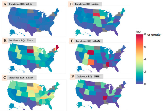 Figure 1A–F, below, shows choropleth maps of the RQs from the race/ethnicity-specific analysis by state.