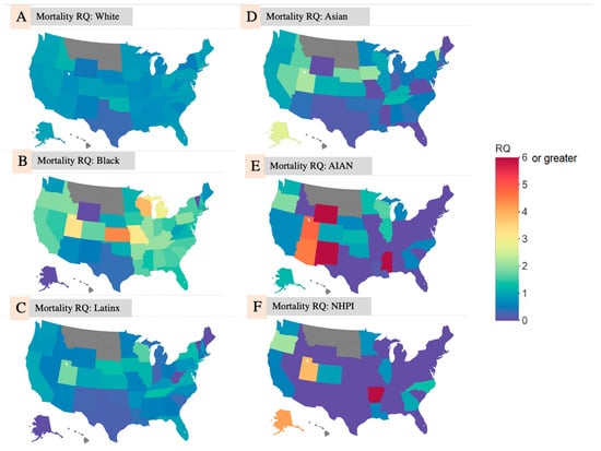 Figure 2A–F shows choropleth maps for the deaths RQ from the race/ethnicity-specific analysis on a state-by-state level.