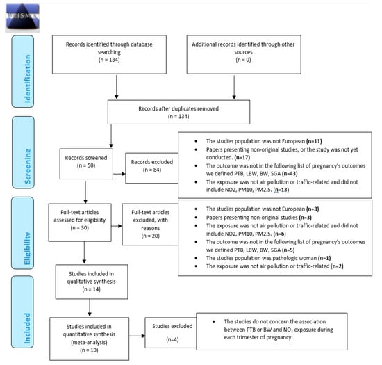 At last, meta-analysis was performed when at least four studies were available for measures of association between a given outcome and a pollutant. Consequently, of the 14 articles included in this systematic literature review, 4 were excluded according to the inclusion criteria for the meta-analysis. Finally, 10 articles were included in the meta-analysis.