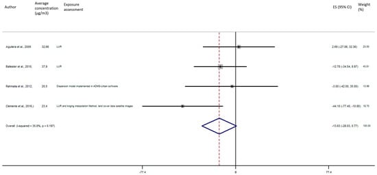 Most frequently, the studies investigate exposure to air pollutants separately NO2, PM10 and PM2.5 [,,,,,,] or exposure to PM2.5 and NO2 [,,,] or exposure to PM10 and NO2 [,,,,,,] or exposure to NO2 [,,,,,,,,,] or exposure to PM10 [,]. Some papers have used a monitoring station-based approach with average from all monitoring stations [,] or average from existing monitoring stations [,,,,,,] but most used a modeling-based approach with, on the one hand, land-use regression, LUR [,,,,,,,,,,,,], and on the other hand dispersion models [,,,,,,]. Few studies use other models as spatial temporal interpolation method (Kriging method) [] and system for integrated modeling of atmospheric composition (SILAM model) [].