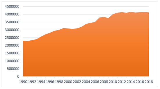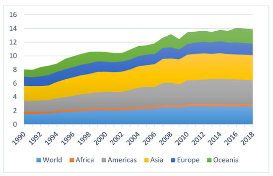 Since the late 1930s when the organic synthetic pesticides were synthesized, pesticide consumption and varieties at the global level have continuously and dramatically increased, with the quantity expanding more than fifty-fold so far [6]. According to the latest data from Food and Agriculture Organization (FAO), the total pesticide consumption quantity of the world has risen from 2.3 million tonnes in 1990 to 4.1 million tonnes in 2018 [39] (Figure 1). Global pesticide trade has been also on the rise in a consistent fashion as shown by Figure 2. Moreover, pesticide use has been increasingly intensified across the world, although with unequal paces in different regions (Figure 3).