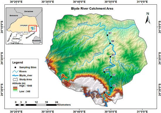 The river is subjected to various sources of anthropogenic pollution, including domestic waste (S1 and S2), agricultural runoff (S3 and S5), and industrial waste (Site 4), while S6 and S7 are nature reserves (Table 1). The sampling sites were spread along the Blyde River until near the confluence with the Olifants River. The study sites ranged between 24°30′59.46” S 30°47′56.14” E and 24°15′30.38” S 30°50′13.22” E (Figure 1).