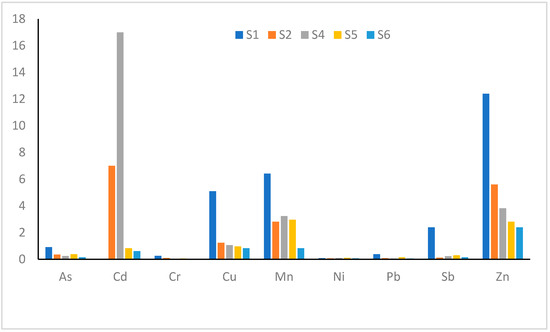 The mean concentrations of the elements in the sediment samples at the different sites are shown in Table 2. The concentrations of As, Cu and Sb varied significantly among the different sites (p < 0.05). The variations in the concentrations of the elements among sites could be due to the type of effluents washed into the river from the catchment. The highest concentrations of As, Cu, Sb, and Zn were recorded at S3. The highest concentrations of Cr, Mn and Ni were recorded at S5, and the highest concentrations of Cd at S6.