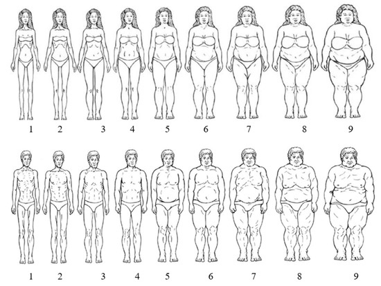 - Bulik, C.M.; Wade, T.D.; Heath, A.C.; Martin, N.G.; Stunkard, A.J.; Eaves, L.J. Relating body mass index to figural stimuli: Population-based normative data for caucasians. Int. J. Obes. 2001, 25, 1517. [Google Scholar] [CrossRef]