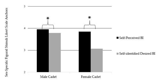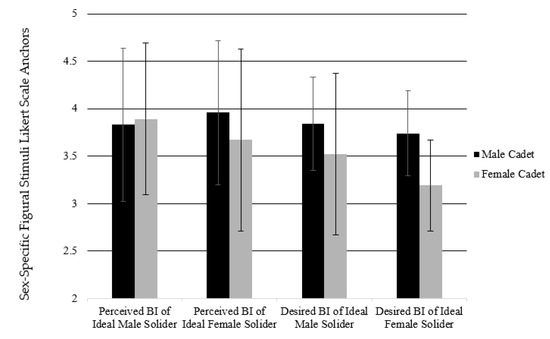 The repeated measures ANOVA revealed a main effect between sex and BI self-perceptions (F1,100 = 22951.19, p = 0.01, η2 = 0.996). Significant interactions were found with perception (F1,100 = 32.28, p = 0.01, η2 = 0.244) and perception and sex (F1,100 = 12.57, p = 0.01, η2 = 0.112). When exploring female and male cadet BI perceptions of male and female soldiers, a significant main effect was found between cadet perceptions (perceived BI, desired BI) in both male and female soldier (F1,100 = 48556.96, p = 0.01, η2 = 0.998). Significant interactions were found with perceptions (F1,100 = 12.82, p = 0.01, η2 = 0.114), perceptions and sex (F1,100 = 5.82, p = 0.018, η2 = 0.055), ideal sex (F1,100 = 22.75, p = 0.01, η2 = 0.185), ideal sex and sex (F1,100 = 4.30, p = 0.41, η2 = 0.041), and perception and ideal sex (F1,100 = 7.6, p = 0.01, η2 = 0.071). All BI perception data can be found in Table 5 and Figure 2 and Figure 3.