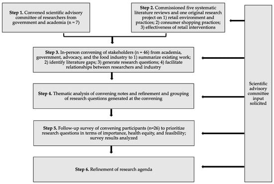 The research agenda was developed through an iterative process between October 2019 and July 2020 that included the following steps: (1) convening a scientific advisory committee; (2) commissioning five systematic literature reviews and one original research project on food retail practices and interventions; (3) in-person convening of expert stakeholders; (4) thematic analysis of meeting notes and refining research questions; (5) follow-up survey of convening participants; and (6) developing the final research agenda (Figure 1). The scientific advisory committee provided input at each stage of the process. This agenda-setting process was based on methods used by Duffy et al. [12].
