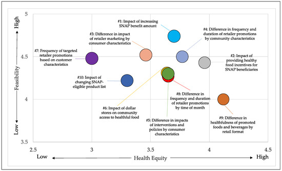 Research questions with the 10 highest composite scores from the follow-up survey. Numbers listed before questions represent ranking from 1–10 by composite score. Research questions were ranked on a 5-point Likert scale in terms of feasibility (y-axis) and health equity (x-axis). Ratings for importance are not displayed due to low variation (3.8–4.5) among the top ten questions. SNAP is the Supplemental Nutrition Assistance Program.