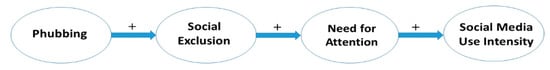 In addition, analyses were conducted to examine possible negative psychological outcomes of the effects predicted and supported in the results above. Specifically, the PROCESS Model 6 [58] was used to test a serial mediation model in which perceived phubbing has a relationship with not only to feelings of exclusion, need for attention, and social media intensity, but also with anxiety and depression. Consistent with the findings by David and Roberts (2017) [18], the results (F(4, 152) = 11.26, p < 0.01, R2 = 0.23) showed support for sequential mediation, such that perceived phubbing has a significant and positive indirect relationship with anxiety and depression via feelings of being excluded, need for attention, and then social media intensity.