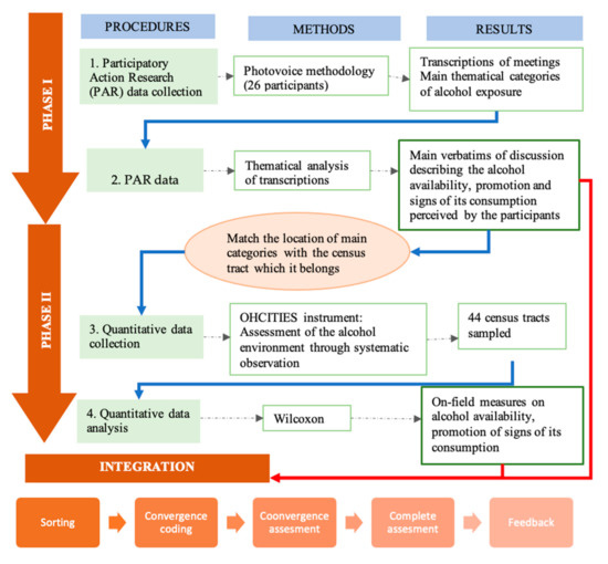 This study was organized in two phases according to a sequential exploratory design [41,46]. First, we used Photovoice to measure residents’ perceived alcohol environment [40]. Second, according to the Photovoice findings, we used systematic social observation to obtain on-field measures on the alcohol availability, its promotion, and signs of its consumption [31]. Figure 1 shows the design of the study.