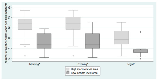 Distribution of the availability of alcohol according to the income level of the district in the city of Madrid, Spain, in 2018. Availability was measured as the number of outlets that were open: (1) In the morning (from 6 a.m. to 2 p.m.); (2) In the evening (from 3 p.m. to 10 p.m.); (3) At night (from 11 p.m. to 5 a.m.); per 1000 inhabitants. * Significant differences. p-values were estimated with a Wilcoxon test between the high-income level area (leisure area) and low-income level area (residential area) with a level of confidence of 95%.