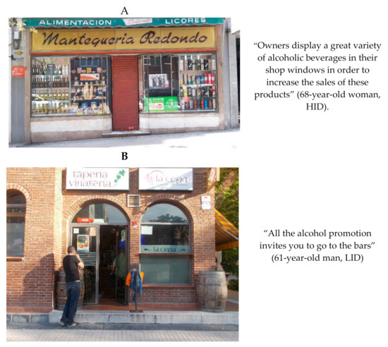 (A) Perceived alcohol availability in a high-income level neighborhood. Photograph: “If you don’t sell alcohol, you don’t sell”. (B) Perceived alcohol availability in low-income level neighborhood. Photograph: “A tolerated vice”. Examples of the availability results obtained in the high-income district (HID, Chamberí) (A) and in the low-income district (LID, Villaverde) (B) through Photovoice.