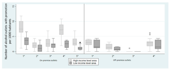 Distribution of the alcohol promotion according to the income level of the district in the city of Madrid, Spain, in 2018. It was measured as: (1) Number of (at least one) signs of alcohol promotion; (2) Number of alcohol outlets with the presence of advertisements; (3) Number of alcohol outlets with the presence of structural elements (awnings, labels, and/or specific alcohol beverage menu); (4) Number of alcohol outlets with alcohol products (alcohol bottles or cans) exhibited in shop windows and/or inside the venue visible from outdoors, and/or (5) alcohol outlets with the presence of furniture (i.e., barrels, alcohol boxes, tables, chairs, umbrellas, napkin holders, or ashtrays) associated with an alcohol brand. Furniture and terraces were recorded only in on-premise alcohol outlets. All the measures were expressed as the number of alcohol outlets with the presence of alcohol promotion element per 1000 inhabitants. * Significant differences. p-value were estimated with a Wilcoxon test between high-income level area (leisure area) and low-income level area (residential area) with a level of confidence of 95%.