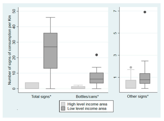 Distribution of the signs of alcohol consumption according to the income level of the district in the city of Madrid, Spain, in 2018. It was measured as: (1) Total signs of alcohol consumption (bottles and/or cans, people drinking alcohol or disposable cups) identified along one kilometer of roadway within the census tract; (2) Bottles and/or cans identified in along one kilometer of roadway within the census tract; (3) Other signs of alcohol consumption different from bottles or cans such as people drinking alcohol or disposable cups identified along one kilometer of roadway within the census tract. * Significant differences. p-value were estimated with a Wilcoxon test between a high-income level area (leisure area) and a low-income level area (residential area) with a level of confidence of 95%.