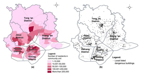 The distributions of population (a) and locally listed dangerous buildings (b) in community units in Xiamen.
