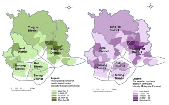 Using Equation (11) and the values of parameters provided in Section 4.4, the number of deaths in each evaluation unit is measured, respectively, in situations of earthquake intensities of VI degrees, VII degrees and VIII degrees in Xiamen. The distributions of the number of deaths in three earthquake scenarios are visualized by ArcGIS software. The expected number of deaths in each evaluation unit increases with the rise in earthquake intensity. According to the calculation results of the empirical study in Xiamen, three people on average may die in an earthquake with an intensity of VI degrees (frequent earthquake), 367 people on average may die in an earthquake with an intensity of VIII degrees (rare earthquake). As for the estimated fatalities in a frequent earthquake in Xiamen, the values are below 1 in all the evaluation units, indicating that the life safety issue can be basically guaranteed in this scenario. In some areas such as central Xiang’an District, poor housing quality might lead to higher casualties, even in a frequent earthquake. Using Equation (7), the loss of VSL in each evaluation unit is measured, respectively, in situations of earthquakes with intensities of VII degrees and VIII degrees in Xiamen. Their distribution patterns are similar to the distributions of the number of deaths in the three earthquake scenarios shown in Figure 4.