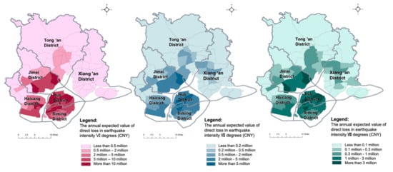 Through the calculation formulas and parameter values provided in Section 4.2, the direct economic loss in each evaluation unit is measured, respectively, assuming earthquakes with intensities of VI degrees, VII degrees and VIII degrees in Xiamen. The distributions of the direct economic loss in three earthquake scenarios are visualized by ArcGIS software (Figure 3). The direct economic loss in each evaluation unit increases with the rise in earthquake intensity. According to the calculation results, the expected total direct economic losses amount to about 17.5 billion (CNY) (2.5% of the total value) when the earthquake intensity is VI degrees (a frequent earthquake), 64.9 billion (CNY) (9.4% of the total value) when the earthquake intensity is VII degrees (an earthquake of fortification intensity), and 223.6 billion (CNY) (32.4% of the total value) when the earthquake intensity is VIII degrees (a rare earthquake) in Xiamen. Major economic losses are expected to be concentrated in Siming District, Huli District and coastal areas of Haicang District and Jimei District due to dense urban development and economic activities. Several evaluation units with the highest direct economic loss in earthquakes are found to have a number of urban villages with lower construction standards, making them difficult to protect in severe disasters and leading to a great number of casualties and large economic losses, even in an earthquake of fortification intensity.