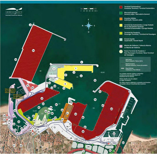 Port of Valencia. Source: [1]. Numerical legends: 1—East Breakwater, 2—Lighthouse, 3—Chemical and Oil Terminal, 4—Transversal East, 5—East Breakwater Quay, 6—East Dock, 7—Ro-ro and Vehicle Terminal 1, 8—Ro-ro and Vehicle Terminal 2, 9—North Quay (Xitá), 10—Xitá Dock, 11—Scrapyard Quay, 12—Port services (pilots, tug boats and mooring), 13—Llavera Quay, 14—Levante Quay, 15—Container Terminal 3, 16—Moveable bridge, 17—Veles e Vents building, 18—Access to Juan Carlos I Royal Marina, 19—Customs gate, 20—Customs Administration, 21—Foreign Health Department, 22—Valencia 2007 Consortium, 23—Customs Quay, 24—Inner Dock, 25—Grao Quay, 26—Clocktower building, 27—Avda. del Puerto, 28-Avda. Baleares, 29—Former Terminal Quay, 30—Nazaret Quay, 31—Fish Market, 32—Transversal Quay, 33—Poniente Quay, 34—Ferry Terminal/Passenger and Cruise Terminal, 35—Port Police, 36—Valencia port Foundation, 37—Port Authority of Valencia, 38—Nazaret gate, 39—Naval Command, 40—Plant Health Service, 41—Foreign Trade Inspection Centre, 42—Levante Dock, 43—North Turia Jetty Quay, 44—End Turia Jetty, 45—Turia Dock, 46—South Turia Jetty Quay, 47—Turia Quay, 48—General and bulk cargo, 49—Passenger Terminal, 50—South Quay, 51—Solid Bulk Terminal, 52—Spanish Customs Control Authority, 53—Technical and Nautical services Dock, 54—Container Terminal 2 (MSC), 55-PIF, 56—Harbourmaster’s Office, 57-Cold sage warehouses, 58—CPE Valencia, 59—Logistics warehouse, 60-Logistics Activities Area (ZAL), 61—South Access, 62—ZAL Access, 63—New Turia riverbed, 64—Royal Valencia Yacht Club, 65—Costa Quay, 66—Transversal Costa Quay, 67—Príncpie Felipe Quay, 68—Public Container Terminal 1, 69—Marine Civil Guard Building, 70—South Dock, 71—East Wuay, 72—Entrance channel, 73—North Extension Breakwater, 74—New Container Terminal, 75—Container depot 1, 76—Container depot 2. 77—Connection to national rail network.