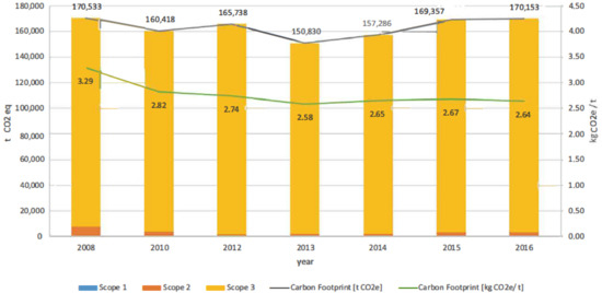 The scope that improved the most was scope 2, reducing its carbon footprint by 57.78% between 2008 and 2016. Scope 1 had a significant improvement of 28.98%; however, the carbon footprint of scope 3 increased by 2.49%.