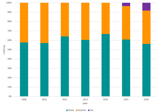 where g stands for each gas (CO2, CH4, and N2O), C stands for the consumption associated with each category, and EF represents the gas emission factor for the i category. Emission factors were obtained from the Spanish Ministry for Ecological Transition and Demographic Challenge [32,33]. Emissions factors for each year assessed and its source are described in Appendix A.