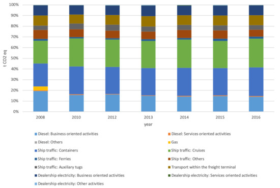 The carbon footprint associated with container ships’ traffic increased by 35.48% between 2008 and 2016, while the emissions associated with ferries’ traffic increased by 21.34%. The carbon footprint of the traffic of cruises and auxiliary tugs increased by 15.34% and 9.98%, respectively. However, the subcategory of “traffic of other ships” decreased by 15.86%. As this category represents the 20% in energy consumption of the ship traffic category, the result of the category implies an increase of only 20%. This value does not imply a significant growth as the activity rises 24.33% during the analysis period.