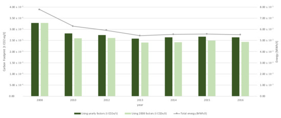 A second assessment was made applying the emission factors of 2008 (first year of study) to all the period under analysis (Figure 7). The energy consumption [24] was also included in this assessment for comparative purposes.