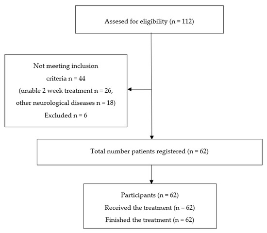 In total, 112 patients replied, of which 26 were not able to spend the time required for treatment and another 18 had other neurological diseases (Parkinson disease, multiple sclerosis and Poliomyelitis) and did not meet the inclusion criteria. Concerning the exclusion criteria, 2 patients had heart failure NYHA 3-4, 2 were Ramkin 4, 1 had colon cancer and 1 bullous dermatitis. Finally, 62 patients were considered eligible for the start of the program. All participants included in this study gave their informed consent. The study was conducted in accordance with the regulatory standards of Good Clinical Practices and the Helsinki Declaration 2000. The selection process of the study participants is shown in Figure 1.