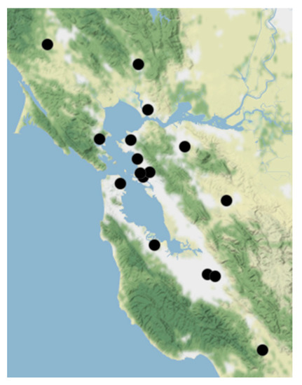 We gathered data on daily 24-h average and daily maximum hourly average PM2.5 concentrations (μg/m3) from the BAAQMD. We included all the BAAQMD ground-level monitors in the Bay Area that measured PM2.5 concentrations during 2017 and 2018, which yielded a total of 16 stations in both urban and non-urban settings. The locations of these stations are displayed in Figure 1. The BAAQMD validates their data through audits for quality assurance that meet the U.S. Environmental Protection Agency’s requirements.