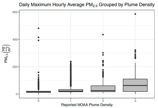 When analyzing data from the entire 2017–2018 wildfire seasons in California, we found that there is much variability in maximum daily PM2.5 concentrations within each smoke plume category (Figure 2). Categories 0, 1, and 2 have many outliers at the upper end of their distribution of PM2.5 concentrations, which indicates high PM2.5 concentrations on days assigned a smoke plume score less than 3. Outliers were distributed across monitoring sites, with no sites particularly prone to outlier values. The median values for daily maximum hourly average PM2.5 concentration for smoke plume density categories 0, 1, 2, and 3 are 16, 22, 25, and 63 μg/m3, respectively. These findings do not align well with the theoretical target PM2.5 concentration range referenced for smoke plume categories 1–3 (0–10; 10.5–21.5; ≥22) [30,31]. Despite this variability, a test for trend indicates a significant increasing trend in PM2.5 when considering all four categories (p < 0.001) and only the categories where a smoke plume is present (categories 1, 2, and 3; p < 0.001).