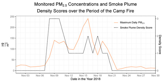 Focusing on the 2018 Camp Fire as an example, the time-series plot (Figure 3) demonstrates that PM2.5 concentrations and smoke plume density scores in the city of San Francisco started to significantly increase around 8 November 2018 and decreased by 21 November 2018: a 2-week period. Both of these increases are associated with high levels of air pollution that can be attributable to the wildfire. However, there is a significant disparity in PM2.5 characterization by ground-level monitoring and the HMS during this time frame. While the daily maximum PM2.5 concentration spikes to its maximum during the second week, the smoke plume density score is highest at the beginning of this time frame and remains smaller for the rest of the period. Notably, the PM2.5 concentrations at this location are substantially higher than the intended smoke plume 3 values for the entire interval, and air pollution assessment via ground-level monitoring of PM2.5 concentration and satellite imagery of smoke plumes differ temporally. Use of the smoke plume data alone could give the false impression that wildfire smoke exposure posed a higher health risk early in the event.