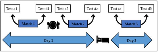 The competition took place in Valencia in May 2019, with an environmental temperature of 24 °C. Two different championships were held, a women’s and a men’s. Six samples of saliva were collected from each participant during the tournament. As seen in Figure 1, the first sample was collected before match 1 on day 1 of the competition (9 a.m.) and the second aftermatch 1 (10 a.m.). The third and fourth samples were taken before and after match 2 (4:20 p.m. and 5:20 p.m., respectively). Finally, the fifth and sixth samples were obtained the following day, before and after each team’s match 3 (11:00 a.m. and 12:00 p.m., respectively). The samples of saliva were collected 5 min before and 5 min after each match. Samples were collected from all participants in the study who needed to rinse their mouths with distilled water in order to avoid altering the samples with food left in the mouth that could contain a high content of acid or sugar. At least 2 mL of unstimulated saliva was collected in 10 mL sterile plastic tubes that were then stored in a container with ice. The procedure had an approximate total duration of 5 min. The samples were then centrifuged in the laboratory at 1500 g for 15 min, and the supernatant was frozen and stored in micro sample tubes at −20 °C until the samples were ready to be analysed.