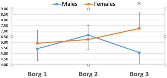 Comparison between men and men of perceived exertion as established by the modified Borg scale after the 3 matches. Borg: modified Borg scale of perceived exertion; * significant differences p < 0.05 with the Mann–Whitney U Test.